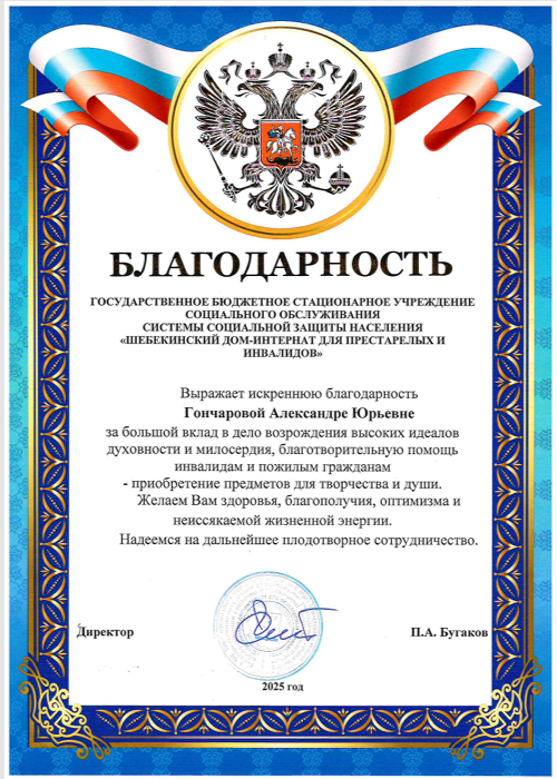Шебекинский дом-интернат для престарелых и инвалидов, выражает искрению блогодарность Гончаровой Александре за большой вклад в дело возрождения высоких идеалов духовности и милосердия, благотворительную помощь инвалидам и пожилым гражданам - приобриьение предметов для творчества и души.