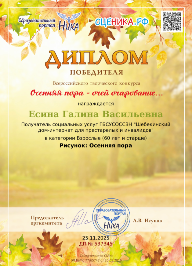 Дипломом победителя награждена Есина Галина за участие во всероссийском творческом конкурсе для детей и взрослых с ограниченными возможностями «Осенняя пора-очей очарование…» Тема работы: рисунок – «Осенняя пора».