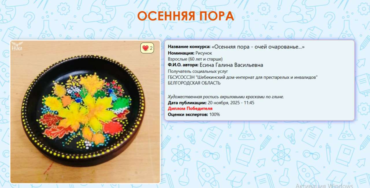 Поздравляем нашего победителя и призера, принявшего участие во Всероссийском творческом конкурсе «НИКА»! Работы нашего получателя социальных услуг, находящегося на стационарном социальном обслуживании, получил призовое место!