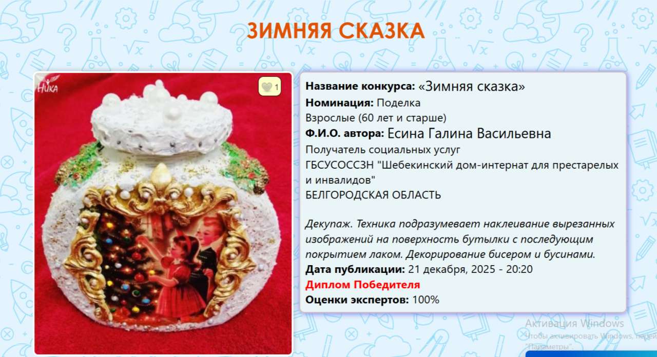 Шебекинский дом-интернат для престарелых и инвалидов от всей души поздравляет получателя социальных услуг Есину Галина с блестящей победой во Всероссийском творческом конкурсе «НИКА». Тема работы: зимняя сказка (поделка). Эта победа стала ярким событием не только для Галины, но и для всего нашего учреждения. Её талант и кропотливый труд, вложенные в создание поделки, заслуженно получили высокую оценку жюри конкурса. Мы искренне гордимся достижениями наших получателей социальных услуг и стремимся создавать все условия для развития их творческого потенциала. Участие в подобных конкурсах имеет огромное значение для социальной адаптации и реабилитации людей, находящихся на стационарном обслуживании. Это возможность проявить себя, почувствовать свою востребованность и получить новые впечатления. Мы выражаем огромную благодарность Галине за её усердие и вдохновение, которое она дарит всем нам своим творчеством. Желаем ей дальнейших успехов, новых побед и неиссякаемого вдохновения! Пусть её талант продолжает расцветать и радовать нас своими замечательными работами. Мы уверены, что впереди у неё еще много ярких и значимых достижений.