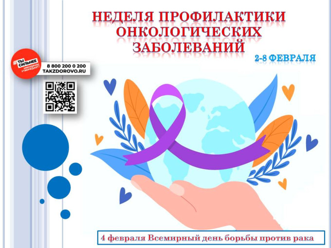 | Неделя профилактики онкологических заболеваний 02 Февраля 2026, 11:52 Неделю со 2 по 8 февраля 2026 года Минздрав России объявил Неделей профилактики онкологических заболеваний (в честь Всемирного дня борьбы против рака 4 февраля). Почему это важно? Ежегодный рост числа онкобольных остаётся серьёзной проблемой мирового масштаба. Профилактика играет ключевую роль в снижении заболеваемости раком. Онкологические заболевания – это общее название большой группы болезней, которые могут поражать любую часть организма. Используются также такие понятия, как злокачественные опухоли и новообразования. Одним из характерных признаков новообразований является быстрое образование аномальных клеток, прорастающих за пределы своих обычных границ и способных проникать в близлежащие части тела и распространяться в другие органы. Этот процесс называется метастазом. Метастазы являются основной причиной смерти от рака. Онкологические заболевания – это реальность. В настоящее время можно предотвратить возникновение 30-50 % раковых заболеваний, если избегать факторов риска. Как это сделать? С помощью простых, но мощных шагов: