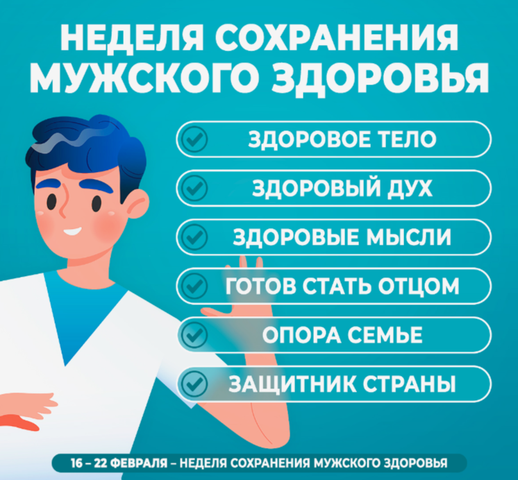 | Неделя сохранения мужского здоровья. 16 Февраля 2026, 11:04 С 16 по 22 февраля 2026 года в Российской Федерации проходит Неделя сохранения мужского здоровья. Здоровье мужчины — это совокупность физического, психического и социального благополучия. ️Основные правила сохранения мужского здоровья: - внимательно следить за состоянием своего здоровья и периодически обращаться к врачу - следовать назначенному лечению -️ вести активный образ жизни -️ полноценно высыпаться и правильно питаться -️ отказаться от вредных привычек Внимательное отношение мужчин к себе — залог общего благополучия. ️По данным ВОЗ, средняя продолжительность жизни мужчин на 5–7 лет меньше, чем у женщин. Это связано не только с биологическими факторами, но и с пренебрежением профилактикой: -️ 40% мужчин избегают посещения врача даже при явных симптомах. -️ Рак простаты, легких и колоректальный рак — в топе причин смертности. -️ Сердечно-сосудистые заболевания становятся причиной каждой третьей смерти у мужчин старше 40 лет. -️ Депрессия и суициды среди мужчин часто остаются незамеченными из-за стигмы вокруг психического здоровья. 5 правил для сохранения здоровья: -️Проходите ежегодный чек-ап даже при отсутствии жалоб. -️ Контролируйте вес: окружность талии более 94 см — сигнал о риске метаболических нарушений. -️ Откажитесь от курения и алкоголя: они повышают риск рака, инфарктов и импотенции. -️ Практикуйте физическую активность: 150 минут кардио в неделю снижают риск ССЗ на 30%. ️Не игнорируйте психическое состояние: стресс, апатия и бессонница требуют внимания специалистов.